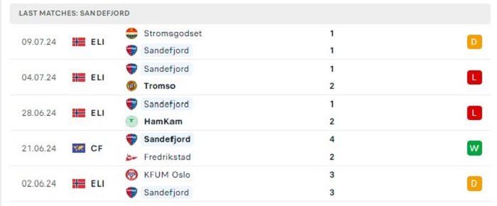 Phong độ gần đây Sandefjord vs Bodo Glimt