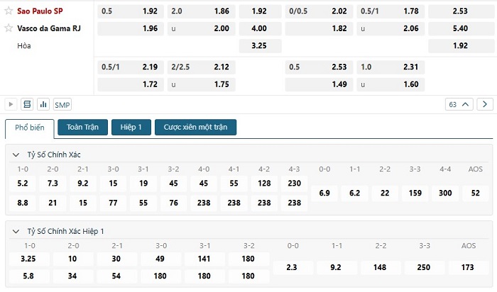 Bảng tỷ lệ kèo bóng đá trận đấu Sao Paulo vs Vasco Gama