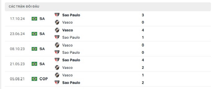 Lịch sử đối đầu của Sao Paulo vs Vasco Gama
