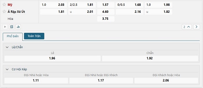 Bảng tỷ lệ kèo bóng đá trận đấu Saudi Arabia vs Mỹ