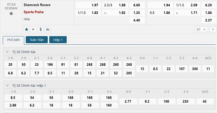 Bảng tỷ lệ kèo bóng đá trận đấu Shamrock Rovers vs Sparta Praha