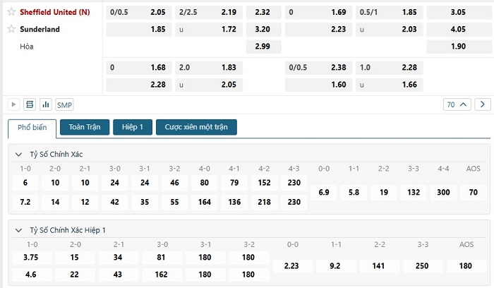 Bảng tỷ lệ kèo bóng đá trận đấu Sheffield United vs Sunderland