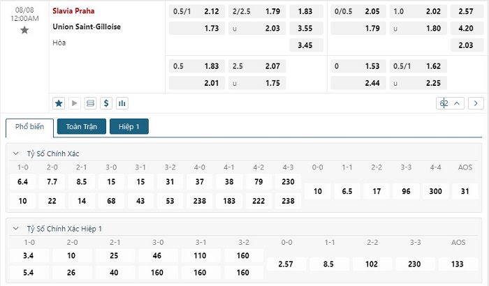 Bảng tỷ lệ kèo bóng đá trận đấu Slavia Praha vs Saint Gilloise