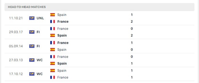 Các lần gặp nhau giữa Tây Ban Nha và Pháp trong những năm qua có tỷ lệ ghi bàn tương đối thấp, thống kê trong cả 9 lần gặp nhau gần nhất chỉ có 2 trận đấu vượt qua được mốc 2 bàn thắng. Hàng công của Pháp đang gặp vẫn đề lớn trong việc xuyên thủng hàng thủ đối phương, chính vì vậy mà trận đấu sắp tới cũng sẽ khó có thể kỳ vọng vào một thế trận bùng nổ của cả hai đội.