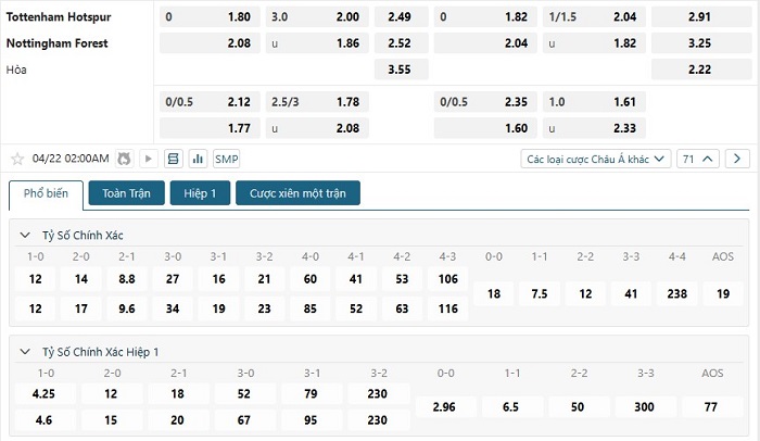 Bảng tỷ lệ kèo bóng đá trận đấu Tottenham Hotspur vs Nottingham
