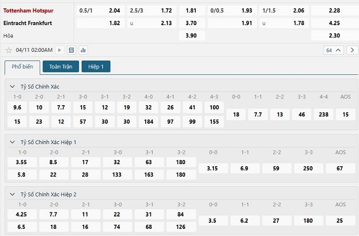 Bảng tỷ lệ kèo bóng đá trận đấu Tottenham vs Eintracht Frankfurt