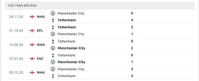Lịch sử đối đầu của Tottenham vs Manchester City