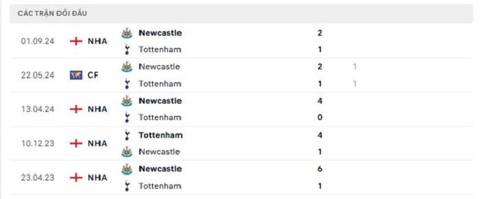 Lịch sử đối đầu của Tottenham vs Newcastle United