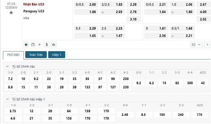 Bảng tỷ lệ kèo bóng đá trận đấu U23 Nhật Bản vs U23 Paraguay