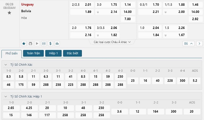 Bảng tỷ lệ kèo bóng đá trận đấu Uruguay vs Bolivia
