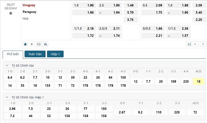 Bảng tỷ lệ kèo bóng đá trận đấu Uruguay vs Paraguay