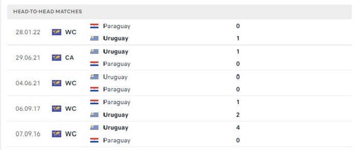 Uruguay vốn cũng đã có được những thành công rất lớn trước Paraguay trước đây, điều này cũng có thể nhận thấy được với thành tích bất bại của họ trước đối thủ này. Tại 10 trận đối đầu trong quá khứ Uruguay có được 6 trận thắng và chỉ 4 lần để Paraguay cầm chân theo mốc kèo châu Âu cả trận, do đó mà với khả hiện tại của mình thì việc có được một thắng lợi theo kèo châu Âu với Uruguay là điều nằm trong khả năng của họ.