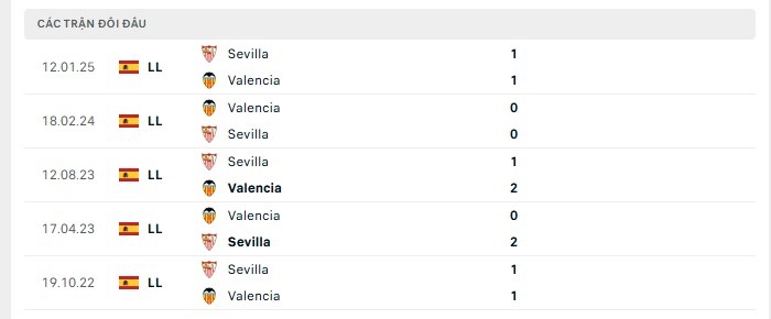 Lịch sử đối đầu của Valencia vs Sevilla