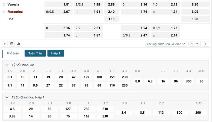 Bảng tỷ lệ kèo bóng đá trận đấu Venezia vs Fiorentina