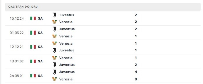 Lịch sử đối đầu của Venezia vs Juventus