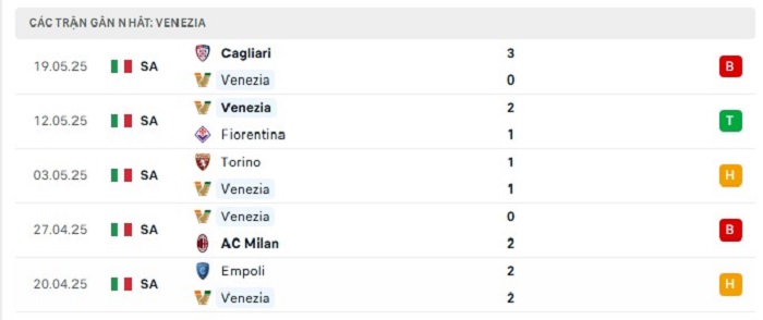 Phong độ gần đây Venezia vs Juventus