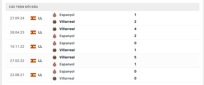 Lịch sử đối đầu của Villarreal vs Espanyol