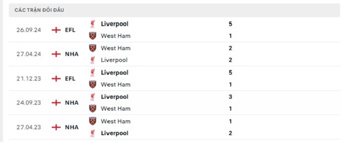 Phong độ gần đây West Ham vs Liverpool