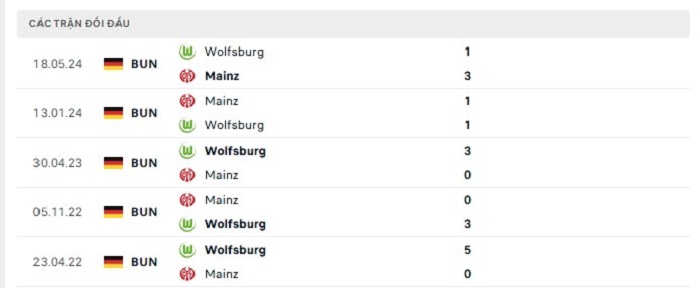 Bảng bóng đá trận đấu Wolfsburg vs Mainz
