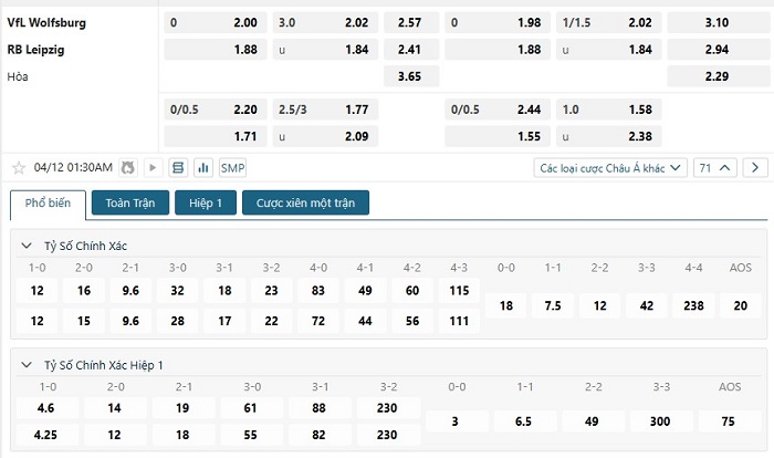 Bảng tỷ lệ kèo bóng đá trận đấu Wolfsburg vs RB Leipzig