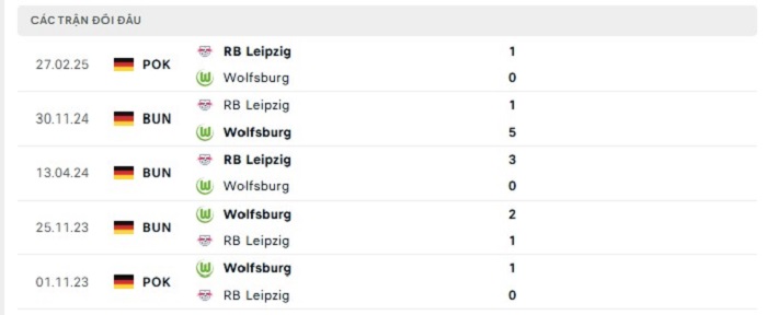 Lịch sử đối đầu của Wolfsburg vs RB Leipzig
