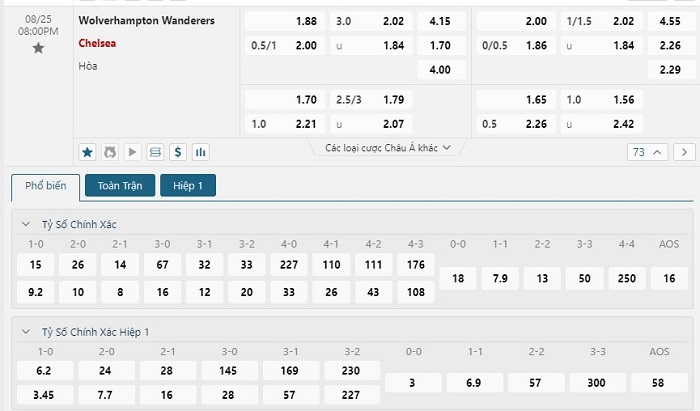 Bảng tỷ lệ kèo bóng đá trận đấu Wolverhampton vs Chelsea